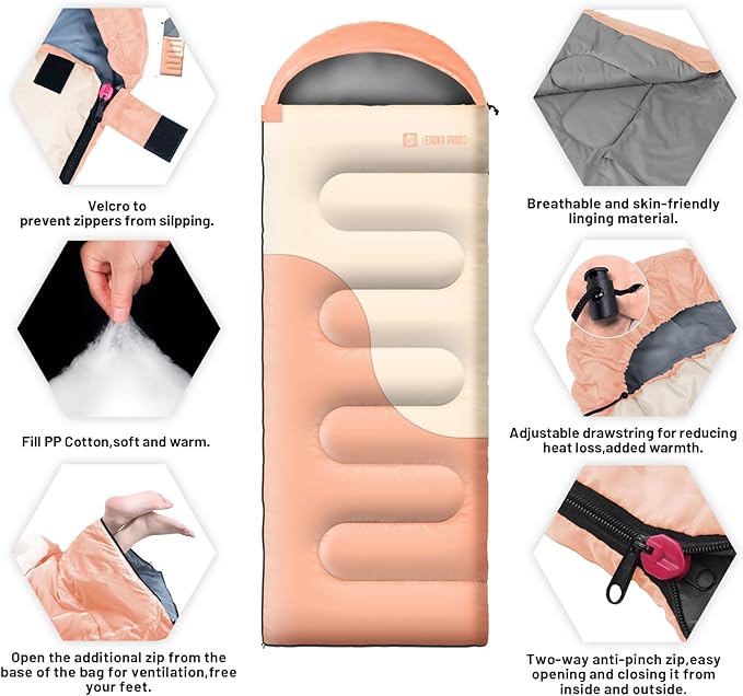 - Comfortable Sleeping Experience:Our sleeping bag can be used in 3 seasons with a design optimal comfort temperature of 59℉,,temp rating 50°F,imit 41°F.This lightweight sleeping bag is perfect for weather camping trips in Spring through to Autumn.Give you a comfortable sleep after a day of adventure outdoor camping, backpacking, hiking, and outdoor travel.