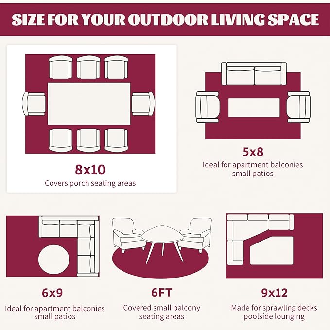 - Waterproof & Easy Cleaning: The outdoor/indoor rugs are water proof and easy to clean. Our rugs resist lots of stains: milk, wine, cola, grass and more. Simply sweep away dirt with water and the breathable design make it possible to airing dry in few minutes. If you are outside without water, you can just wipe it with cleaning cloth or shake it, rid the dust off. Great for keeping dogs out of the dirt.