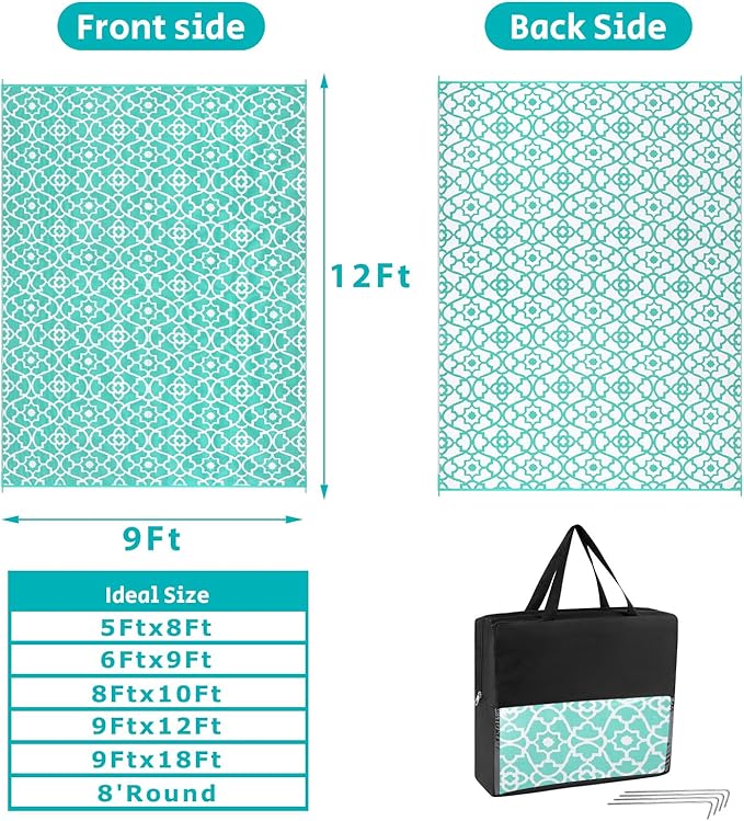 - XXXL Large Reversible Outdoor Rugs: Featuring a classic moroccan pattern on both sides, this rectangular 9x12 ft outdoor area rug allows you to instantly refresh your patio, porch, backyard, deck, RV campsite. And this outdoor deck rug is reversible, two-sided design allows you to have two different looks,both sides can blend perfectly with nature and look very full and comfortable.