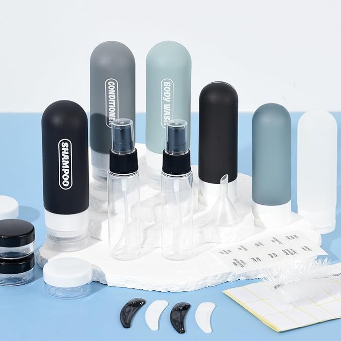 - Variety Of Travel Containers: Set includes 3 silicone travel bottles(90ml/3oz), 3 plastic squeezable tube(60ml/2oz),4 travel jars(10ml/0.3oz), 2 spray bottles(30ml/1oz), 4 spoons, 1 funnel, 1 cleaning brush, and 2 types of labels, as well as 1 transparent makeup bag. Variety of travel containers allow you to take along different toiletries according to your needs.