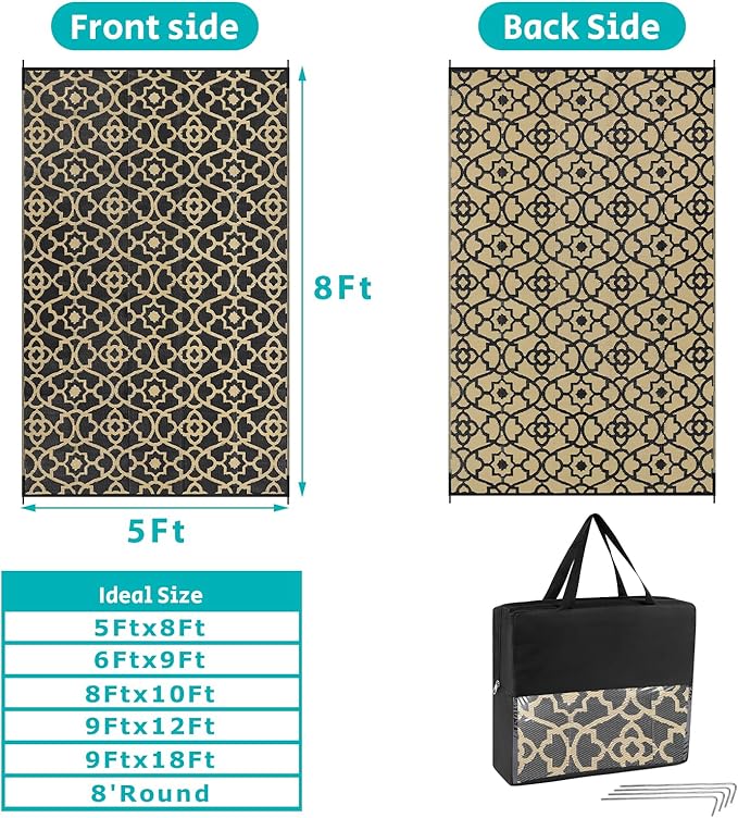• Versatile Outdoor Carpet: The indoor outdoor plastic rugs have multiple choice in different colors(4'x6',5'x8',6'x9',8'x10',9'x12',9'x18',8'round), is ideal for a variety of indoor outdoor activities,like patio mat, deck rug, garden rug, beach mat, picnic mat, BBQ party mat, rv camping rug,pool rug,outdoor doormat,garage rug,front door mat,allowing you to have plenty of imaginable space for more fun.