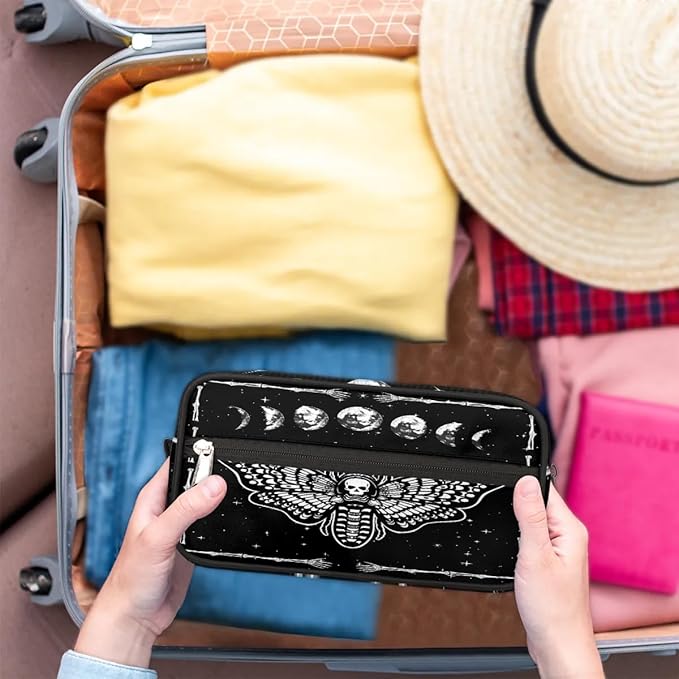 - 【Large Capacity Hanging Toiletry Bag】The gothic skull black makeup bag for boys mens has a large main zipper compartment for storing all other small items needed,such as cosmetics,razors,travel toiletries,etc;The outer layer has a zippered small pocket suitable for storing cash,cards,passports,phones,snacks,and other small items that can be conveniently carried around.