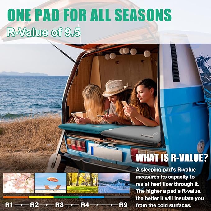 • ใ€๐Ž๐ง๐ž ๐๐š๐ ๐Ÿ๐จ๐ซ ๐€๐ฅ๐ฅ ๐’๐ž๐š๐ฌ๐จ๐ง๐ฌใ€‘: With a R-value of 9.5, our sleeping pad for camping offers superior insulation, moisture resistance and breathability to withstand harsh external environments, you can enjoy a comfortable sleep year-round when traveling. Camping sleeping pad measures 26.37"x 76" x 3.14"after inflation, and folds down to 26.37" x 9", weighs 5.95 lbs, it comes with built-in pillow for head support. Prefect for tent camping, SUV trips, car traveling or as a guest bed.