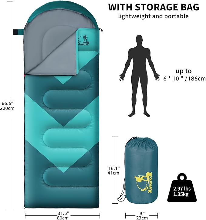 - Comfortable Sleeping Experience:Our sleeping bag can be used in 3 seasons with a design optimal comfort temperature of 59℉,temp rating 50°F-68°F.This lightweight sleeping bag is perfect for weather camping trips in Spring through to Autumn.Give you a comfortable sleep after a day of adventure outdoor camping, backpacking, hiking, and outdoor travel.