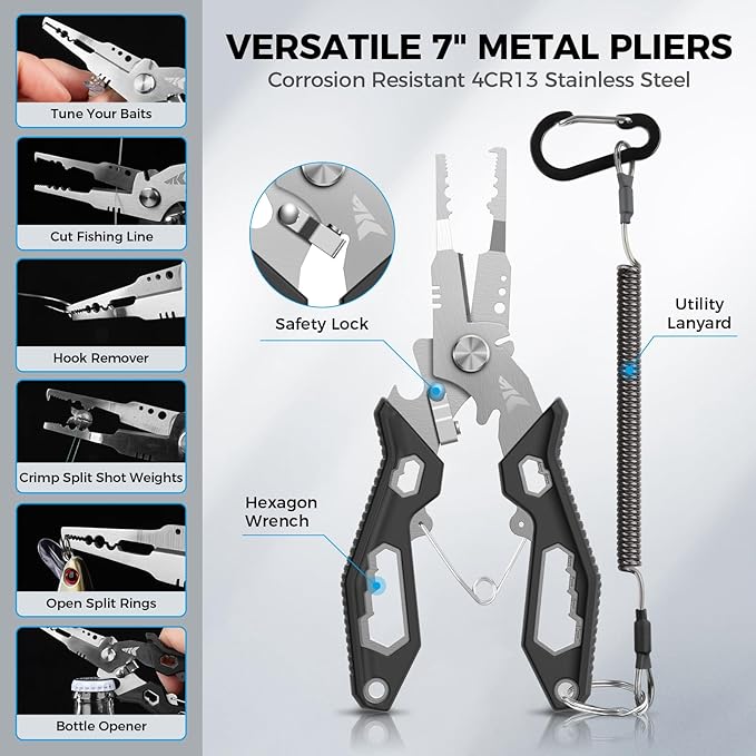 - VERSATILE 7" METAL PLIERS: Crafted from corrosion-resistant 4CR13 stainless steel, this fishing pliers is built to last in tough environments. The non-slip elastomer ergonomic curved handle ensures a secure and comfortable grip, even with wet hands. Designed for versatility, it comes with a lanyard and a safety lock. The fishing pliers handles multiple tasks with ease, including bait tuning, line cutting, hook removal, crimping split shot weights, and opening split rings