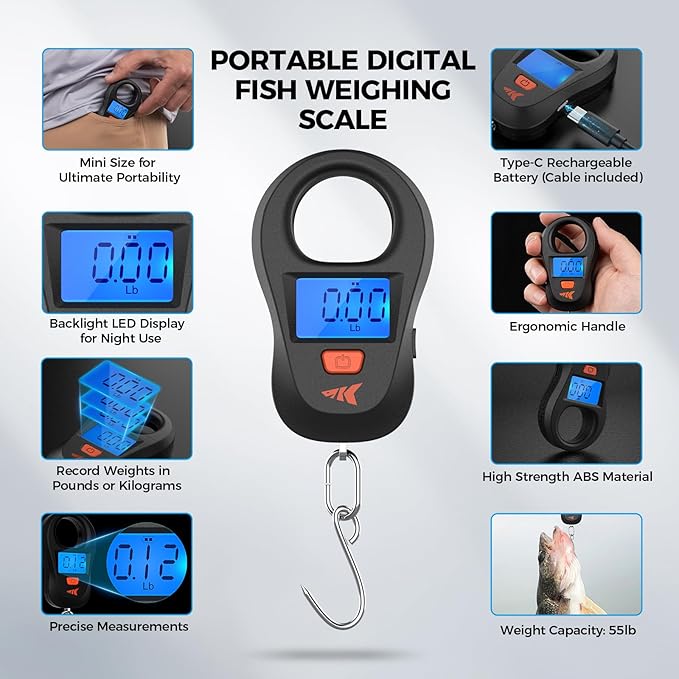 - PORTABLE DIGITAL FISH SCALE & LIP GRIP: Designed with an ergonomic handle and high strength ABS material, the fishing scale offers precise measurements. Its rechargeable battery and USB-C cable make it convenient. With 55lb of weight capacity and features an easy-to-read backlight LED display, it switches between pounds and kilograms easily. The lip grip features one-handed operation and no-puncture design