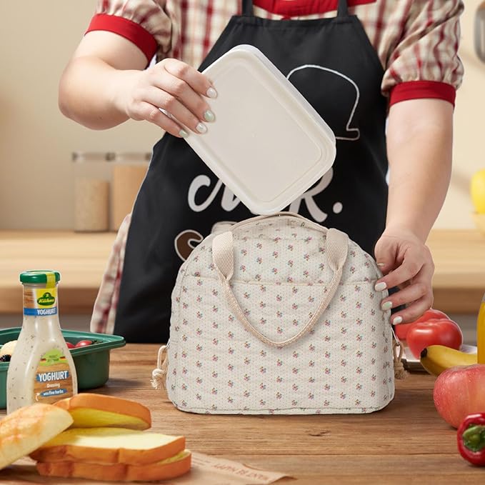 Insulated Lunch Bag, Quilted Beige Floral Design, Thermal Cooler Tote, Portable Large Capacity for Work, School, or Picnic, 8.5L
