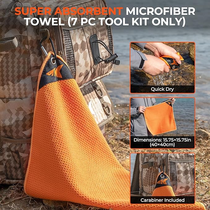 - 15.75” x 15.75” Microfiber Fishing Towel With Carabiner: Stay clean on the water with this super-absorbent microfiber towel, perfect for wiping hands, fishing gear, and rods. The included carabiner clip lets you attach it to your tackle bag, belt loop, or boat for easy access. Durable and quick-drying, it's a must-have accessory for any angler
