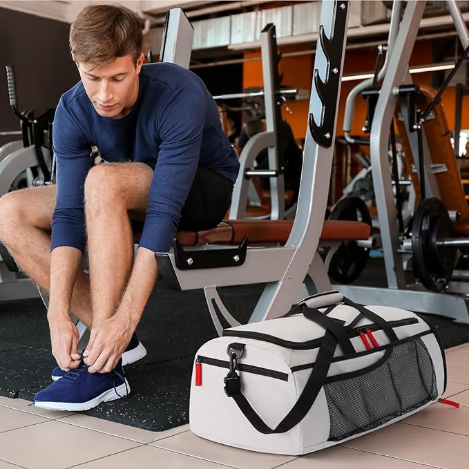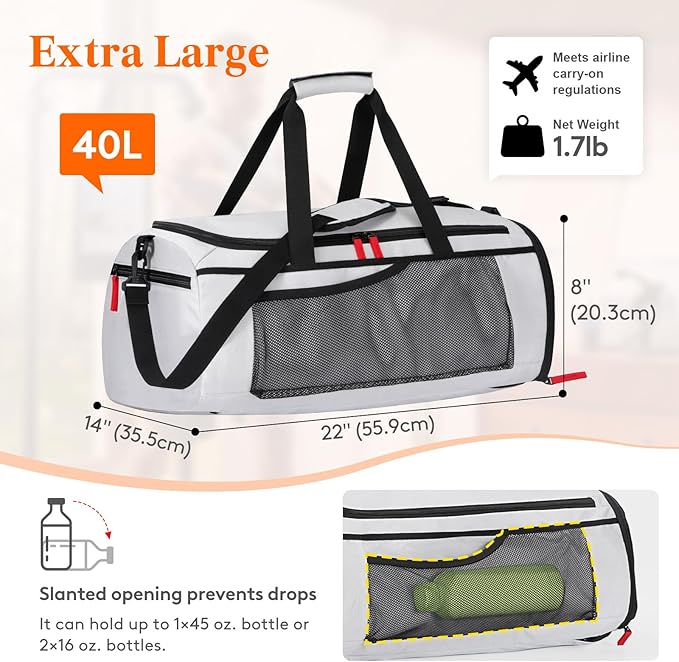 - Extra Large: Measuring 22"×14"×8" with 1.7lb(NW), the gym bags for men meet airline carry-on regulations, ideal for travel. The mesh pocket fits a 45 oz bottle or two 16 oz bottles, and the slanted opening prevents drops no matter how it is carried