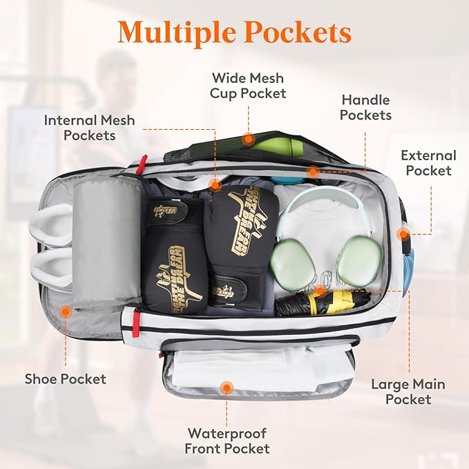 - Multiple Pockets: One waterproof front pocket, one zipper pocket, two handle pockets, one wide mesh cup pocket, one shoe pocket, two internal mesh pockets, and one main pocket, this gym bag with shoe compartment offers convenience for your daily use