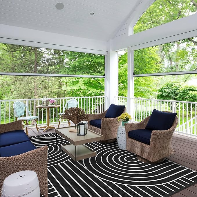 GENIMO Outdoor Rug 6'x9' Patio Waterproof, Lightweight Outdoor Plastic Straw Rug Clearance, Reversible Camping Mat Outdoor Carpet for RV, Picnic, Backyard, Deck, Balcony, Porch, Black & White