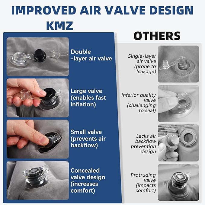 - KMZ SUV Air Mattress – This camping air mattress measures 192*125*12cm(75.59*49.21*4.72in) and comes with an off-white top and light gray bottom. The top and bottom are made of thickened flocking and durable PVC