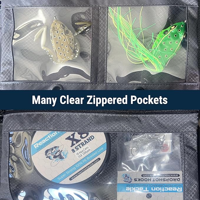 - AMPLE STORAGE CAPACITY: Equipped with multiple clear pockets, mesh pockets, and a front zipper section, providing generous space to store and organize a variety of baits and fishing accessories