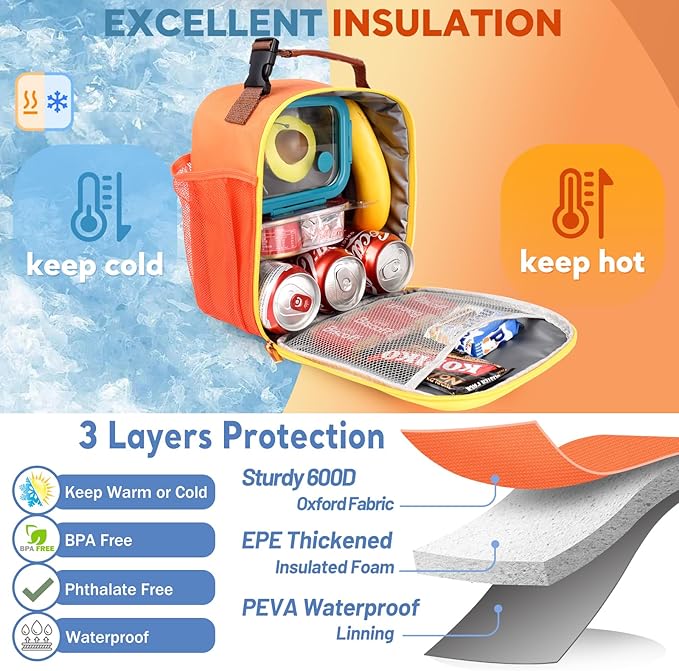 Lunch Box Reusable Lunch Bag for Men Women Kids Adults,Insulated Lunch Bag Waterproof Lunch Box Cooler,Small LunchBox With Side Pockets for Work Office School Travel Picnic-Orange