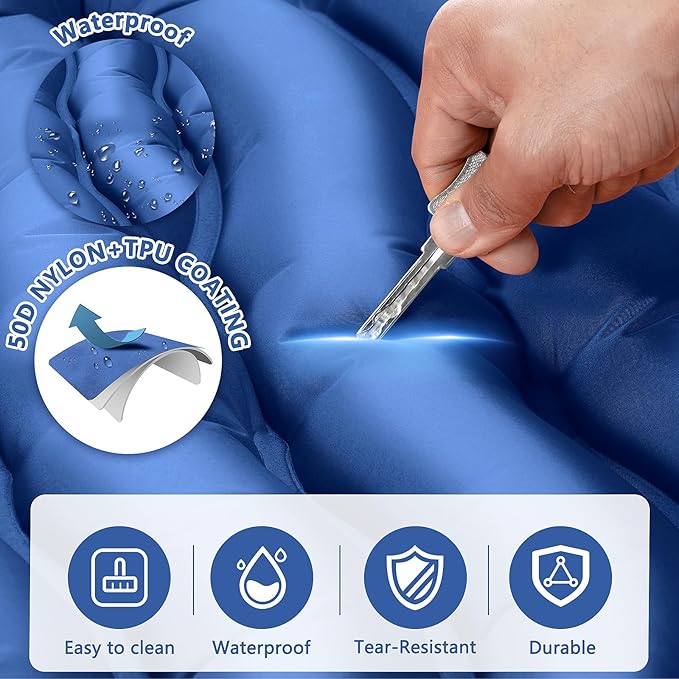 - Durable and Lightweight Design: This camping mat is crafted from outdoor-grade update 50D nylon with a TPU sealing layer, which is abrasion-resistant, tear-resistant, and easy to clean. Ultralight camping mattress ergonomic design ensures a comfortable sleep even in harsh outdoor conditions, making it ideal for hiking, camping, and other outdoor activities
