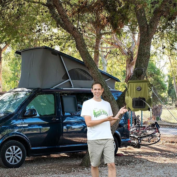• Large capacity beautiful design : Our portable solar shower camping shower bags are designedwith high quality mesh stripes This camping shower bag has a capacity of 5 gallons, Heavyenough water to provide you with bathing and washing useand anywhere,don't be afraid ofcatching cold