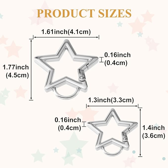 - Package Contains: You will receive 4 pcs zinc alloy star shaped carabiner in total. It contains 2 sizes: big and small. The bigger size is 1.61 x 1.77 in (4.1 x 4.5 cm), the smaller size is 1.3 x 1.4 in (3.3 x 3.6 cm), and the thickness is 0.16 in (0.4 cm). These 2 styles are enough for your daily use