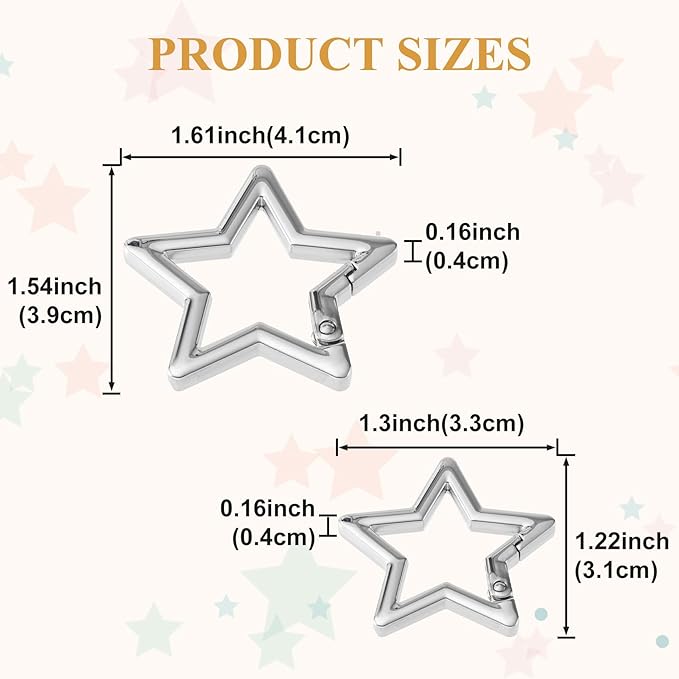 - Package Contains: You will receive 4 pcs zinc alloy star shaped carabiner in total. It contains 2 sizes: big and small. The bigger size is 1.61 x 1.77 in (4.1 x 4.5 cm), the smaller size is 1.1 x 1.4 in (3.3 x 3.6 cm), and the thickness is 0.16 in (0.4 cm). These 2 styles are enough for your daily use