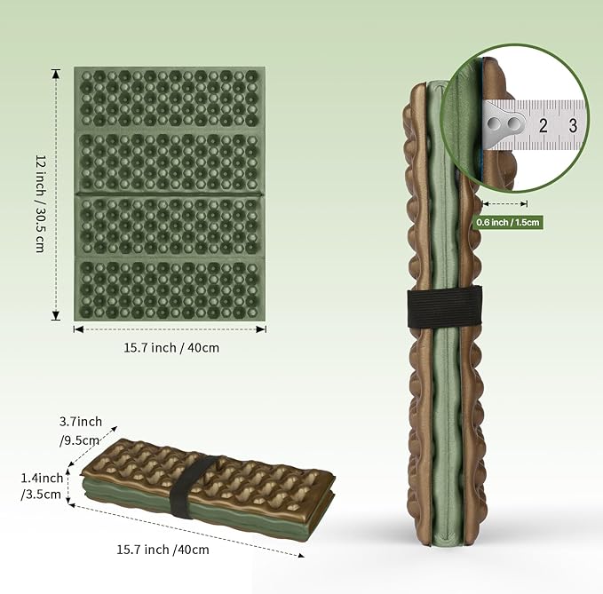 - 𝐏𝐨𝐫𝐭𝐚𝐛𝐥𝐞 𝐒𝐢𝐳𝐞: The sitting pad open size is 15.7x12.0x0.6 inches, folded size is 15.7x3.7x1.4 inches, and weighs only 1.7oz. The foam seat cushion adopts a folding accordion-style structure, making it easy to carry when you go out.