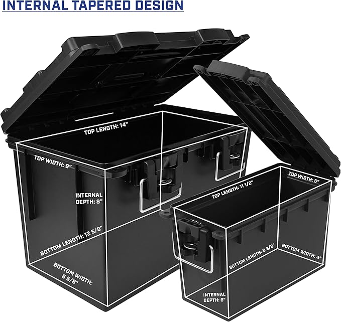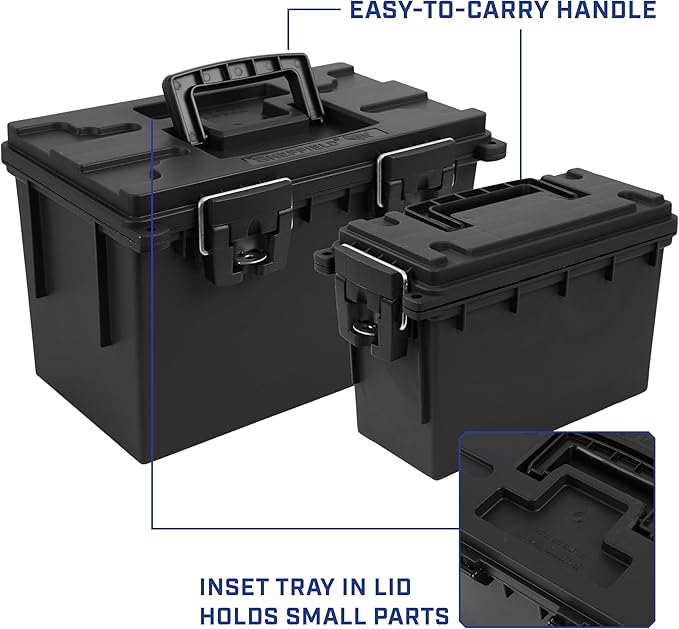 - Versatile Storage: Includes one standard and one XL box. Perfect for .30 Cal, .50 Cal, 9mm, .308, 6.5 Creedmoor ammunition, shotgun shells, and camping gear. The XL box features a lid with a built-in tray for organizing small parts and hardware.