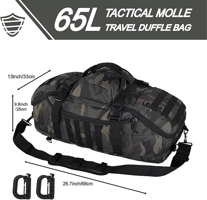 - 【65L Duffle Bag】The tactical bag measures 26.7 x 13 x 9.8 inches -68 x 33 x 25cm, with a large capacity design of 65L. It can be attached with a front velcro patch and can be disassembled to customize your duffle bag according to your needs. Easy to load essential items for sports and travel, designed as a storage tool for sports and travel enthusiasts.
