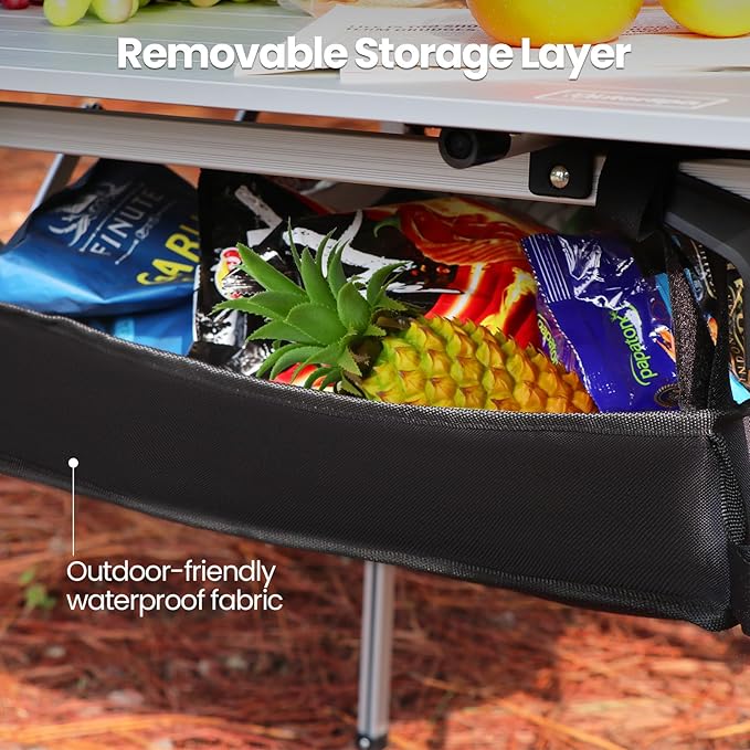 - ๐ฅ๐ฒ๐บ๐ผ๐๐ฎ๐ฏ๐น๐ฒ ๐ฆ๐๐ผ๐ฟ๐ฎ๐ด๐ฒ ๐๐ฎ๐ด: This camping table with storage includes a detachable bag crafted from durable water-proof 600D Oxford fabric, offering additional space for food, drinks, or personal items. The bag is easy to clean and enhances the tableโs functionality, making it ideal for camping and picnics.