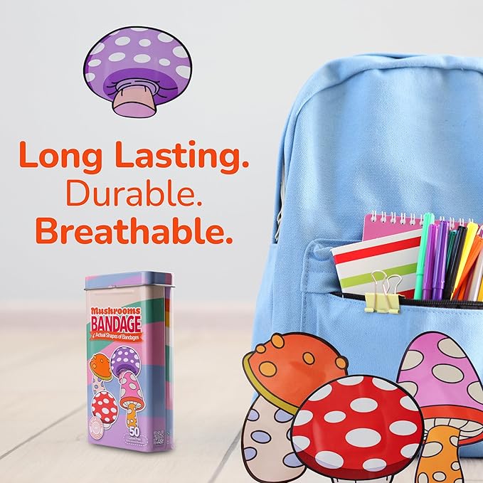 - MUSHROOM BANDAGES: This 50 piece tin of mushrooms shaped bandages features 4 fun mushroom shapes, and is great for putting a smile on kids' faces while protecting wounds such as cuts, scrapes, and burns; sticky bandages come in a cute tin and are perfect for kids and adults alike, and also for school nurses and pediatric doctors