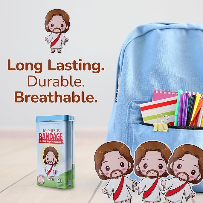 - HOLY JESUS BANDAGES: This 50 piece tin of Jesus shaped bandages is great for putting a smile on kids' faces while protecting wounds such as cuts, scrapes, and burns; sticky bandages come in a cute tin and are perfect for kids and adults alike, and also for school nurses and pediatric doctors