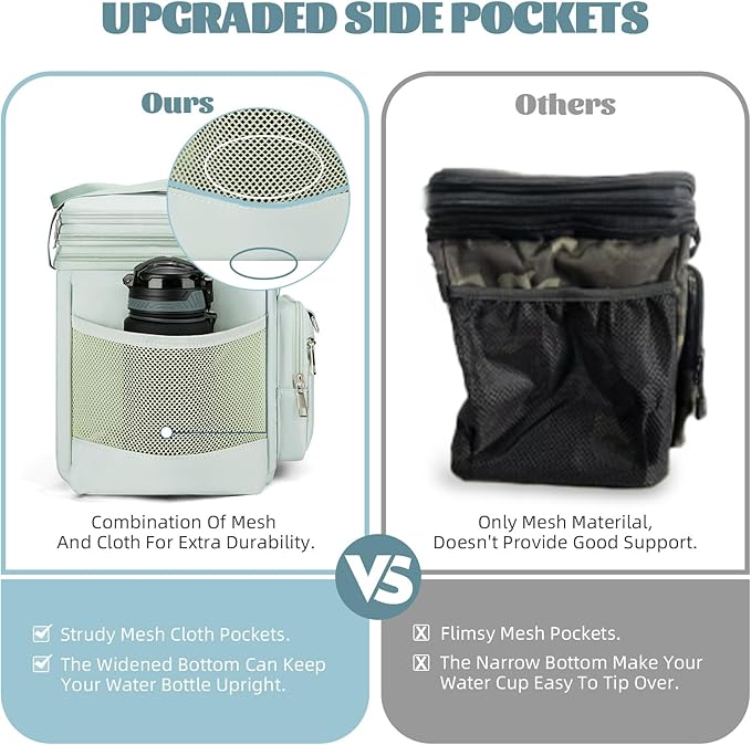 - [Upgraded Side Pockets] Two side pockets are designed with a combination of fabric and mesh, allowing you to safely carry your water bottle and other drinks. The angled design at the bottom of the side pockets allows the water bottle to fit better into the bottom of the side pockets.