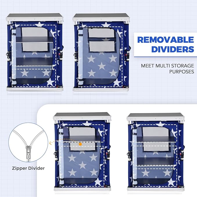 - BREATHABLE & EASY TO CLEAN: EAGLE PEAK portable camping table’s waterproof desktop and the 3 level shelves can be conveniently removed to clean when dirty. 2 mesh backside windows provide breathable airflow. NOTE:the table should not be used in the rain.