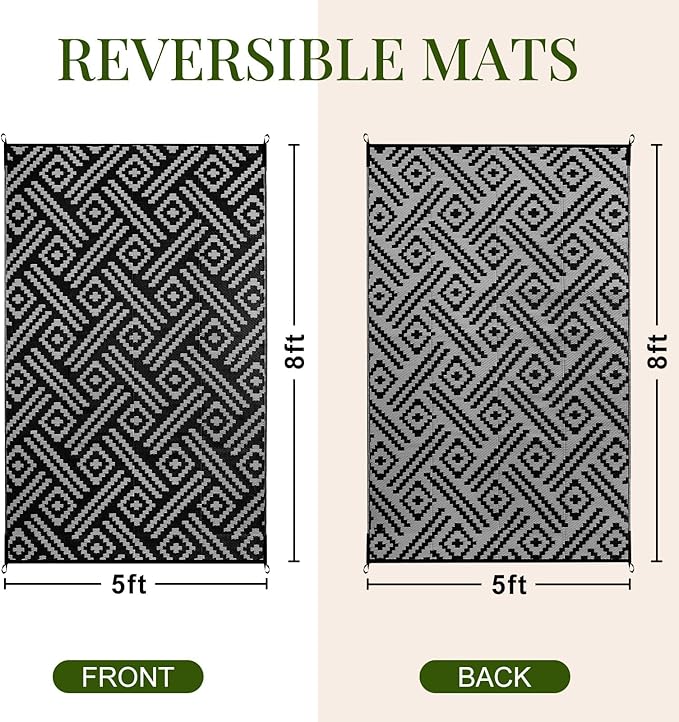 - Versatile Fit for Any Space: From cozy 4’x6’ balcony mats to spacious 9’x12’ patio covers, our washable outdoor rug adapts to your needs. Layer it under picnic tables, in trailers, or as a backyard accent—effortlessly blends with any décor