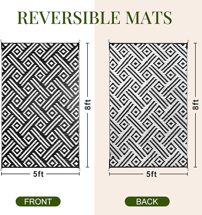 OPPODREAM Outdoor Rug 5x8 Ft, Waterproof Outdoor Plastic Straw Rug for Patio, Reversible Out Door Carpet for Camping, Deck, Rv, 5 x 8 Area Carpet for Balcony, Porch, Backyard, Black and White