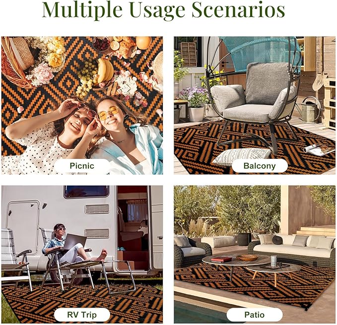 - Versatile Fit for Any Space: From cozy 4’x6’ balcony mats to spacious 9’x12’ patio covers, our washable outdoor rug adapts to your needs. Layer it under picnic tables, in trailers, or as a backyard accent—effortlessly blends with any décor