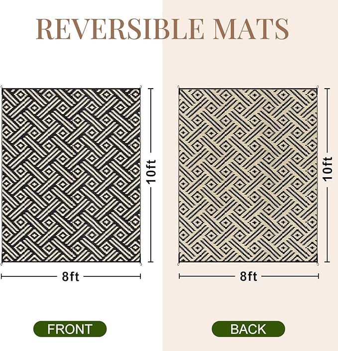 OPPODREAM Outdoor Rug 8x10 Patio Waterproof, Large Outdoor Plastic Straw Rug, Reversible Out Door Carpet Camping Essentials, Deck, Rv, 8 x 10 Area Carpet for Balcony, Porch, Backyard, Black & Beige