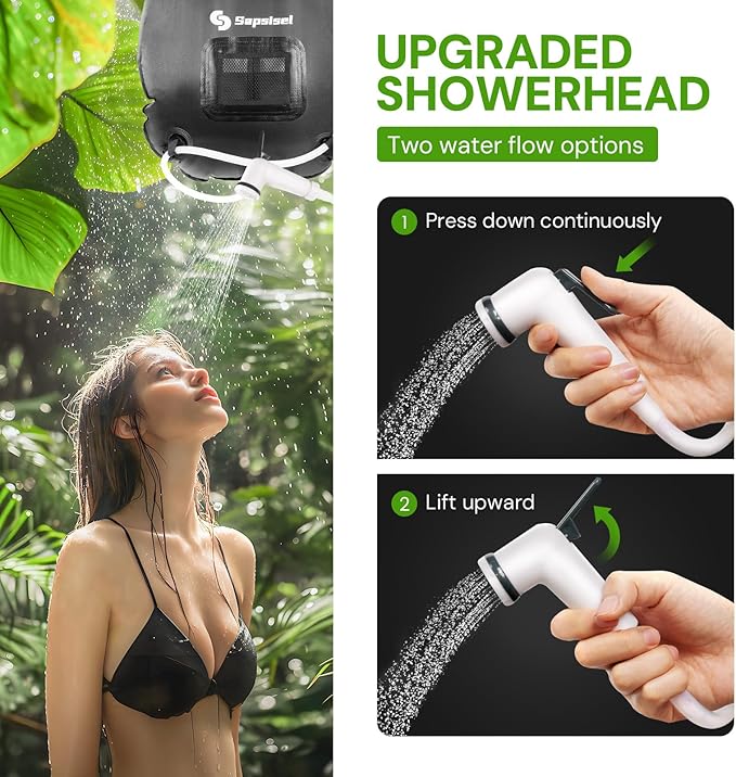 - 【Upgraded Shower Head】 Experience maximum convenience with the upgraded shower head, which features a simple on/off switch for easy control. You can adjust the water flow intensity to your liking, ensuring a personalized and comfortable solar shower. Perfect for outdoor enthusiasts, this portable shower is a must-have for camping.