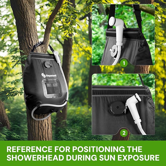 - 【Solar Powered Shower Bag】 Built with durable materials, this shower bag ensures safety and long-lasting performance. Powered by the sun, it heats water up to 113°F (45°C) in just 3 hours, providing a warm shower outdoors without the need for electricity. The temperature indicator makes it easy to know when the water is ready.