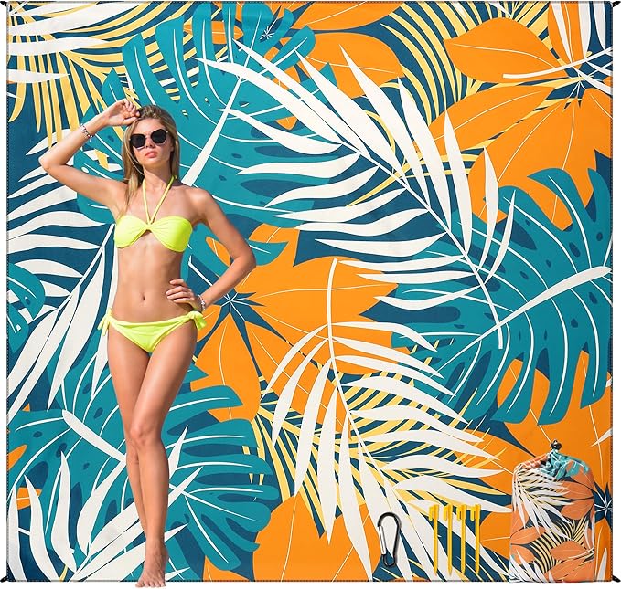 Beach Blanket Waterproof Sandproof Beach Mat 79โx 83โ for 1-4 Adults Quick Drying Durable Outdoor Picnic Mat for Beach Festival Travel Camping Hiking (BK&GN&O-Palm, 79"ร83"(4 Person))