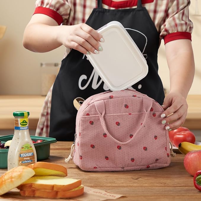 Corduroy Insulated Lunch Bag, Pink with Strawberry Pattern, Thermal Cooler Tote, Portable Large Capacity for Work or Picnic, 8.5L