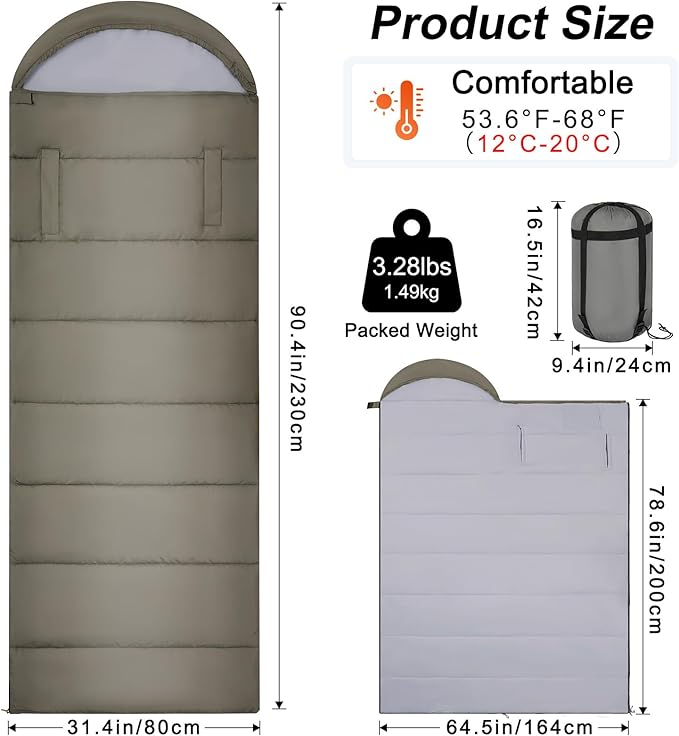 - Size: Measuring 90.4*31.4 inches, this adults sleeping bags offer plenty of space for adults and is suitable for 3 seasons, comfort in temperatures ranging from 53.6°F to 68°F (12°C to 20°C), Ideal for indoor outdoor camping, hiking, and backpacking