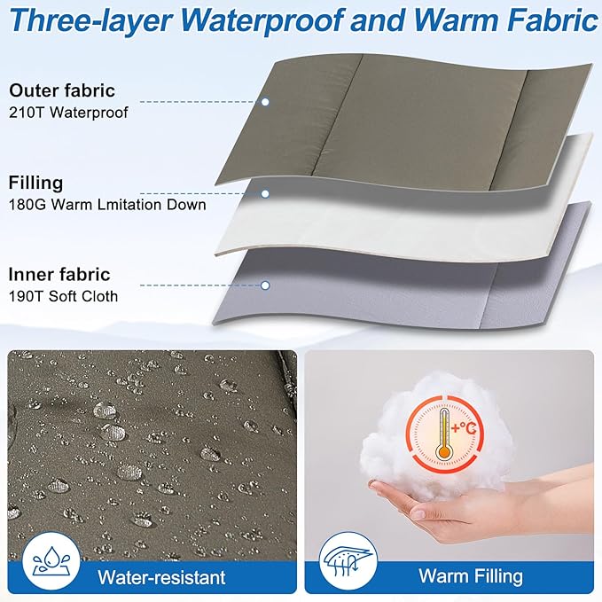 - Material: The camping sleeping bag features a multi-fabric design, with an outer layer made of 210T waterproof polyester fabric, helps you block small moisture, the inner layer is made of 190T soft cloth, while the filling is 180G warm lmitation down, providing enduring warmth; Machine washable without clumping or loss of filling