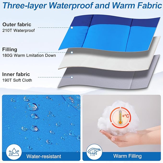 - Material: The camping sleeping bag features a multi-fabric design, with an outer layer made of 210T waterproof polyester fabric, helps you block small moisture, the inner layer is made of 190T soft cloth, while the filling is 180G warm lmitation down, providing enduring warmth; Machine washable without clumping or loss of filling