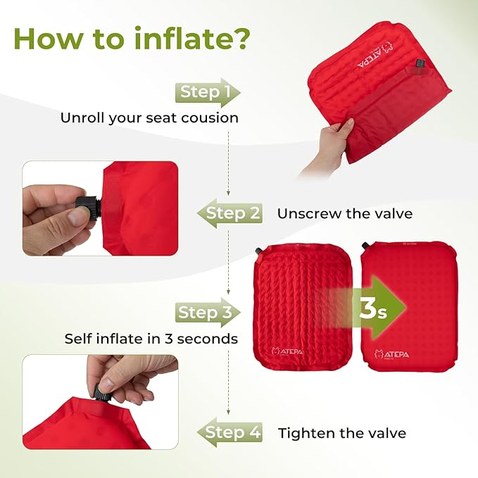 - SELF-INFLATING SEAT CUSHION: The self-inflating cushion inflates in just 3 seconds without any pumping, providing instant comfort. To achieve the ideal thickness, you must inflate it with your mouth for perfect firmness. After use, simply release the valve and roll it up for easy storage