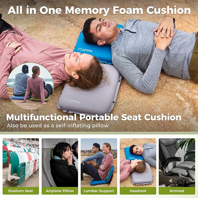 ATEPA Inflatable Stadium Seat Cushion, Self-Inflating Memory Foam Stadium Seats Camping Accessories Chair Pad for Outdoor Airplane Travel Bleacher Patio Backpacking