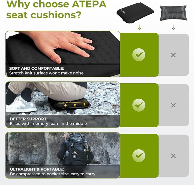 ATEPA Inflatable Stadium Seat Cushion, Self-Inflating Memory Foam Stadium Seats Camping Accessories Chair Pad for Outdoor Airplane Travel Bleacher Patio Backpacking