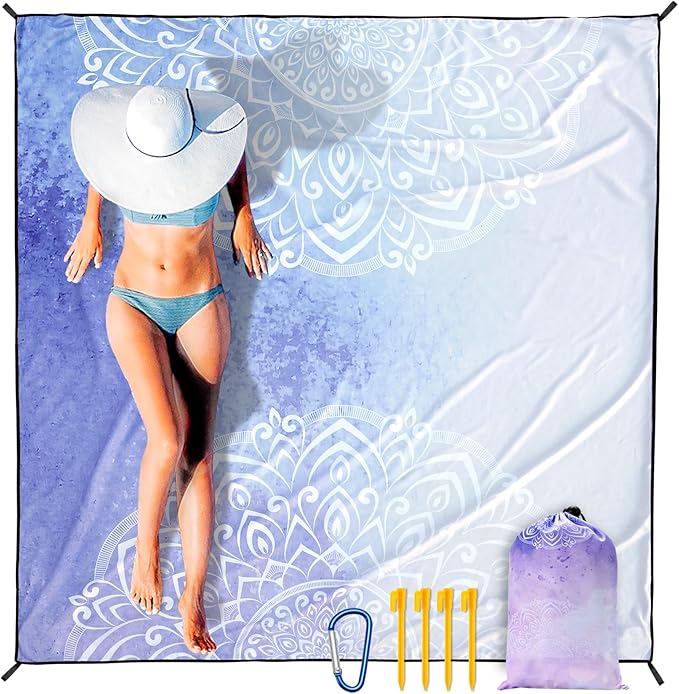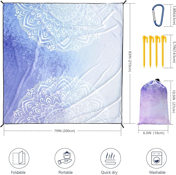 - 🌴【Lightweight Beach Items】79"*83" beach blanket oversized, weighted 0.71 lbs, fit 1-3 adults, and they can be easily folded into a 5.1"×7.5" carry bag.