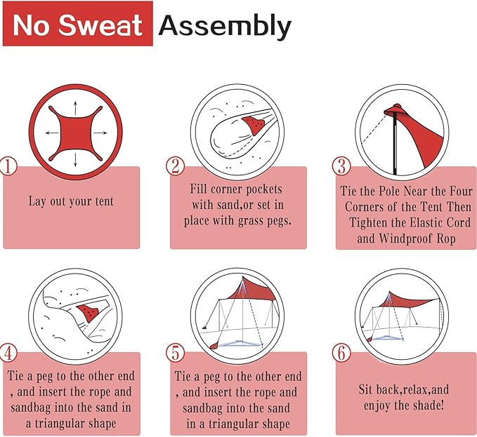 - Adjustable Family Sun Shade: With a size large enough to comfortably accommodate 4 to 8 people. Stay cool and protected from the sun with our adjustable beach sun shade. Easily move the sandbag or adjust the poles to change the angle of the shade and get the perfect shade tents for outdoors