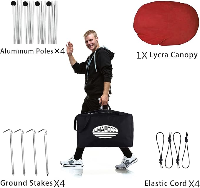 - DURABLE BEACH SHADE CANOPY: The strong and elastic Lycra fabric has UPF 50+ protection and water-resistant function. Rust-proof aluminum poles are attached with a elastic cord preventing moving.