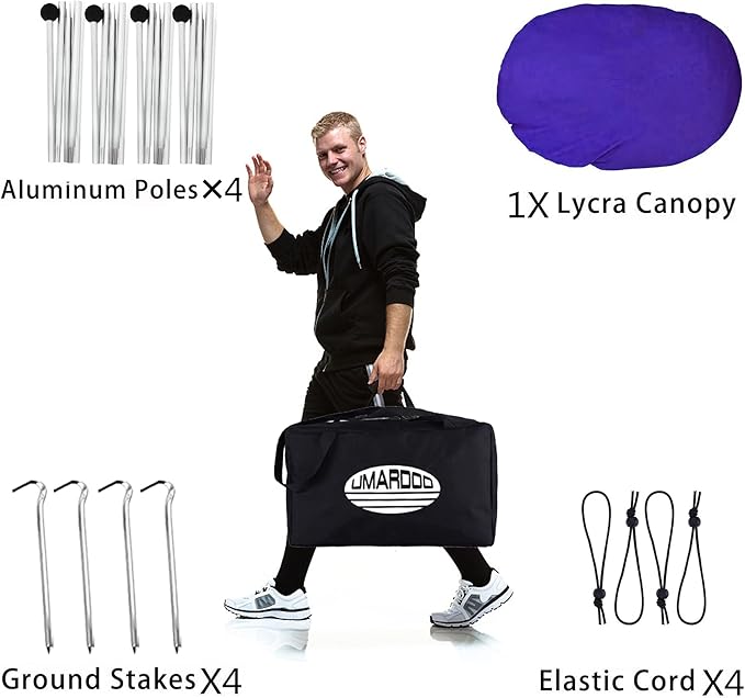 - DURABLE BEACH SHADE CANOPY: The strong and elastic Lycra fabric has UPF 50+ protection and water-resistant function. Rust-proof aluminum poles are attached with a elastic cord preventing moving.