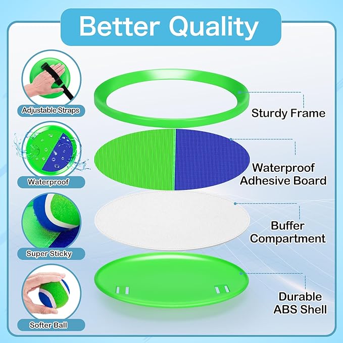 - Better Quality: Our toss ball game set was made of ABS material, not fragile and thicker. We used waterproof material for the lining in the paddles and reinforced double-stitching for extended durability. The sticky piece on the paddle is sturdy, enough to catch to ball easily, the soft ball makes it very easy for kids to remove the ball from the paddle, the perfect beach toys for kids ages 3-5 4-8 8-12.