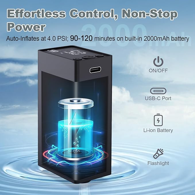 - Intelligent Shower Pump - Featuring the smart auto pressure control for easy, worry-free inflation; 2000mAh rechargeable battery lasts up to 120 mins; built-in flashlight stay prepared for night use or emergency situations. Note:No Foot Pump Included!